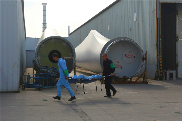 本次演練模擬連云港工廠10#油漆車間因電器隱患發(fā)生火災(zāi),導(dǎo)致大量物資和人員被困。9點(diǎn)50分,各參演隊(duì)伍集結(jié)完畢準(zhǔn)備演練。10點(diǎn)整,通訊組接報(bào)警、報(bào)告火情,第一時(shí)間啟動(dòng)消防應(yīng)急預(yù)案,向119報(bào)警后開展初期火災(zāi)滅火、人員疏散、救護(hù)、物資轉(zhuǎn)移、警戒、切斷廠區(qū)雨水排口等搶險(xiǎn)工作,葉片生產(chǎn)部機(jī)修電工切斷火災(zāi)現(xiàn)場電源、對(duì)儲(chǔ)氣罐進(jìn)行人工卸壓防范爆炸,消防泵房啟動(dòng)加壓水泵。隨著火情不斷擴(kuò)大,模擬的相鄰油漆車間發(fā)生著火,向110、120報(bào)警后繼續(xù)組織滅火。10點(diǎn)15分,接警后開發(fā)區(qū)消防救援隊(duì)三輛消防車入廠開展滅火救援,期間,通訊組向消防救援隊(duì)報(bào)告車間可能還有人員,救援隊(duì)使用專用工具強(qiáng)行破拆變形大門,對(duì)車間內(nèi)部迅速開展搜救,并將被困人員救出。10點(diǎn)20分,火災(zāi)得到控制并完全滅火,總指揮指示清點(diǎn)人員、盤點(diǎn)物資、檢查損失、檢查消防尾水等工作。