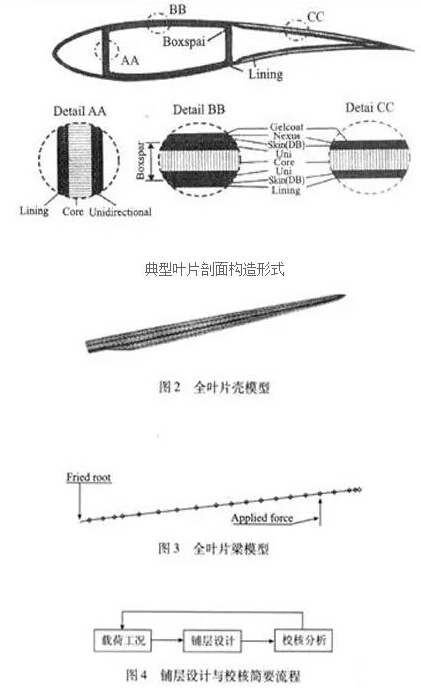 結(jié)構(gòu)鋪層校核對葉片結(jié)構(gòu)設(shè)計來說也必不可少。前在校核方面,大多用通用商業(yè)有限元軟件,比如ANSYS、NASTRAN、ABAQUS等。對葉片進(jìn)行校核時,考慮單層的極限強(qiáng)度、自振頻率和葉尖撓度,分析模型有殼模型和梁模型等,并且能夠做到這兩種模型的相互轉(zhuǎn)換,如圖2,3所示。與其他葉片結(jié)構(gòu)相比,目前大型葉片的中空夾芯結(jié)構(gòu)具有很高的抗屈曲失穩(wěn)能力,較高的自振頻率,這樣設(shè)計出來的葉片相對較輕。有限元法可用于設(shè)計,但更多用于模擬分析而不是設(shè)計,設(shè)計與模擬必須交叉進(jìn)行,在每一步設(shè)計完成后,必須更新分析模型,重新得到鋪層中的應(yīng)力和應(yīng)變數(shù)據(jù),再返回設(shè)計,更改鋪層方案,再分析應(yīng)力和變形等,直到滿足設(shè)計標(biāo)準(zhǔn)為止,如圖4所示。因為復(fù)合材料正交各向異性的特殊性,葉片各鋪層內(nèi)的應(yīng)力并不連續(xù),而應(yīng)變則相對連續(xù),所以葉片結(jié)構(gòu)校核的失效準(zhǔn)則有時候完全采用應(yīng)變失效準(zhǔn)則。