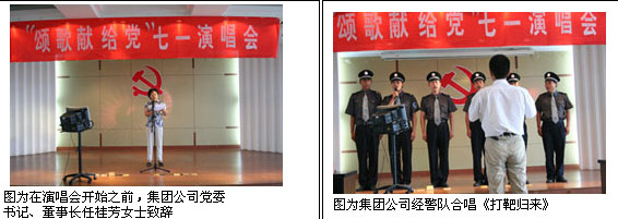2007年6月30日,為了慶祝中國共產(chǎn)黨建黨86周年,集團(tuán)公司黨委在五樓多功能廳組織了“頌歌獻(xiàn)給黨 七一演唱會(huì)”。集團(tuán)公司全體黨員、行管人員、班組長以上干部參加了活動(dòng)。在演唱會(huì)即將結(jié)束時(shí),全體參會(huì)人員一起高歌《沒有共產(chǎn)黨就沒有新中國》將演唱會(huì)推向高潮,全體黨員干部將真抓實(shí)干,為完成2007年度公司各項(xiàng)經(jīng)濟(jì)指標(biāo)而努力奮斗,為黨的十七大獻(xiàn)禮。