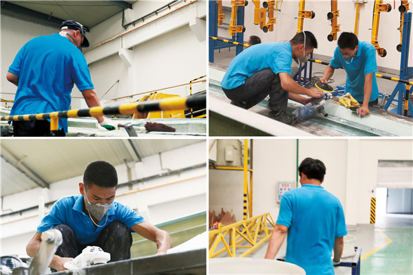 但這個(gè)“收拾”卻用了近半小時(shí),這是工人們與自己較勁的半小時(shí),檢查并確保每一項(xiàng)工作、每一個(gè)細(xì)節(jié)都暫停無(wú)誤才離開(kāi)崗位;而這種“較勁”精神如同浸透衣衫帽檐的汗水,被滿(mǎn)滿(mǎn)傾注在每道工序里,模具處理、殼體鋪層、殼體注膠、殼體固化、殼體清理、合模、補(bǔ)強(qiáng)、葉片表面處理……