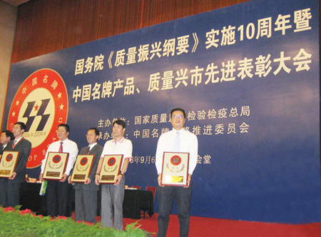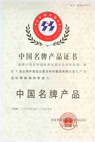2006年9月6日,由國家質(zhì)量監(jiān)督檢驗檢疫總局主辦,中國名牌推進委員會承辦的國務院《質(zhì)量振興綱要》實施十周年暨中國名牌產(chǎn)品、質(zhì)量興市先進表彰大會在北京人民大會堂順利召開。中復連眾生產(chǎn)的“連眾”牌玻璃鋼管道喜獲“中國名牌”稱號,喬光輝總經(jīng)理上臺領(lǐng)取了獎牌和證書。這是暨2005年獲得江蘇省著名商標以來“連眾”牌玻璃鋼管道獲得的又一殊榮。
