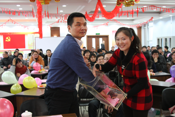 聯歡會還特別安排現場抽獎活動,共抽取了2個特等獎、5個一等獎、10個二等獎和20個三等獎。獲獎觀眾五人一組參與了60秒不NG、心有靈犀、瘋狂大搜索三項互動活動,“笑”果不斷。在帶給大家好運的同時,高管還紛紛登臺獻藝,與職工同樂。喬光輝總經理和行政部吳霏霏帶來《北國之春》;王彤兵副總經理獨唱《月亮代表我的心》;耿婷芳副總經理、行政部朱維新對唱《祈禱》,一首首經典老歌,一聲聲祝福,將晚會推向高潮。