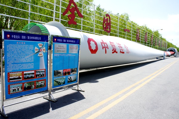 6月21日-22日,由省政府和中國(guó)國(guó)際貿(mào)易促進(jìn)委員會(huì)主辦的2013年中國(guó)(甘肅)國(guó)際新能源博覽會(huì)暨酒泉投資合作洽談會(huì)在酒泉市隆重舉行。中復(fù)連眾(酒泉)復(fù)合材料有限公司攜3MW-55米風(fēng)力機(jī)葉片亮相展會(huì)。