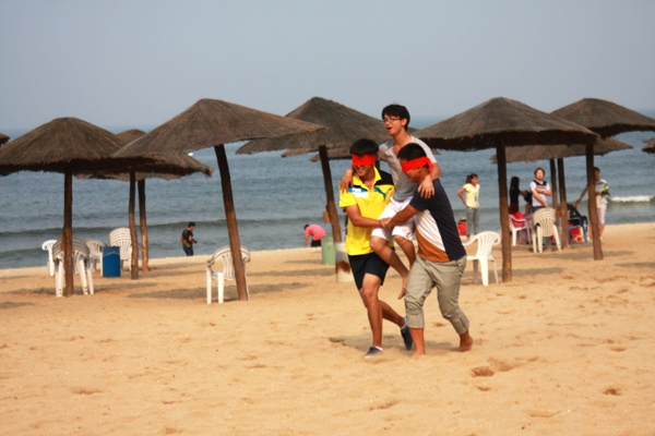 根據(jù)比賽規(guī)則,所有參賽人員平均分成兩隊(duì),每隊(duì)隊(duì)員在確定好各自的參賽項(xiàng)目后,比賽正式開始。在遇險(xiǎn)營救項(xiàng)目中,兩隊(duì)都派出了實(shí)力較強(qiáng)的隊(duì)員,他們從起點(diǎn)出發(fā),蒙著雙眼將兩名隊(duì)員從終點(diǎn)抬到起點(diǎn),在摸索中前進(jìn)的同時(shí),還要謹(jǐn)防對(duì)方隊(duì)員從中搗亂,以最快的速度返回起點(diǎn);單腿跳是一項(xiàng)考驗(yàn)隊(duì)員耐力的項(xiàng)目,每隊(duì)三名隊(duì)員依次拉著前一名隊(duì)員的腳踝,從起點(diǎn)出發(fā),單腿跳到終點(diǎn),柔軟的沙子多次讓比賽隊(duì)員跌倒,隊(duì)友的掌聲激勵(lì)著他們站起來完成比賽;雙方男女隊(duì)員進(jìn)行的兩人三足比拼,將整場比賽推向了一個(gè)沸點(diǎn);比賽在充滿歡聲笑語的后退接力跑中結(jié)束。
