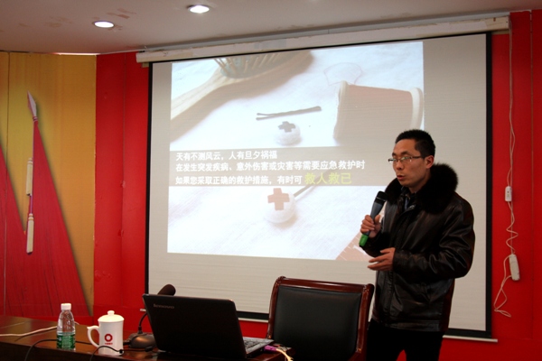 在培訓(xùn)中,刁主任通過多媒體和現(xiàn)場實際演示的方式向大家講解了一些如:止血、包扎、骨折固定與搬運、心肺復(fù)蘇等日常急救常識?;顒舆^程中,廣大員工認(rèn)真聆聽、記錄,最后刁主任給大家現(xiàn)場演示心肺復(fù)蘇,并邀請了兩名員工進行演練。