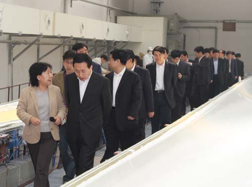 代表團(tuán)隨后來到二分廠8號車間,一邊參觀一邊了解風(fēng)力發(fā)電機(jī)生產(chǎn)工藝。代表團(tuán)贊嘆中復(fù)連眾重視科技創(chuàng)新、重視人才培養(yǎng)的做法,也祝福中復(fù)連眾早日實(shí)現(xiàn)亞洲最大的風(fēng)力發(fā)電機(jī)葉片生產(chǎn)基地的目標(biāo)。