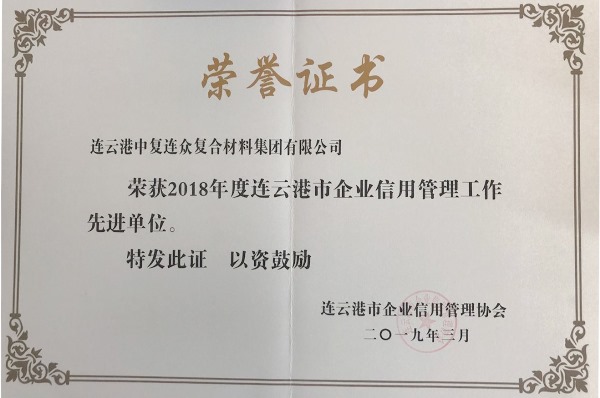 3月21日,連云港市企業(yè)信用管理協(xié)會對榮獲2018年度市級“信用管理先進單位”進行表彰并舉行授牌儀式,中復(fù)連眾榜上有名。
